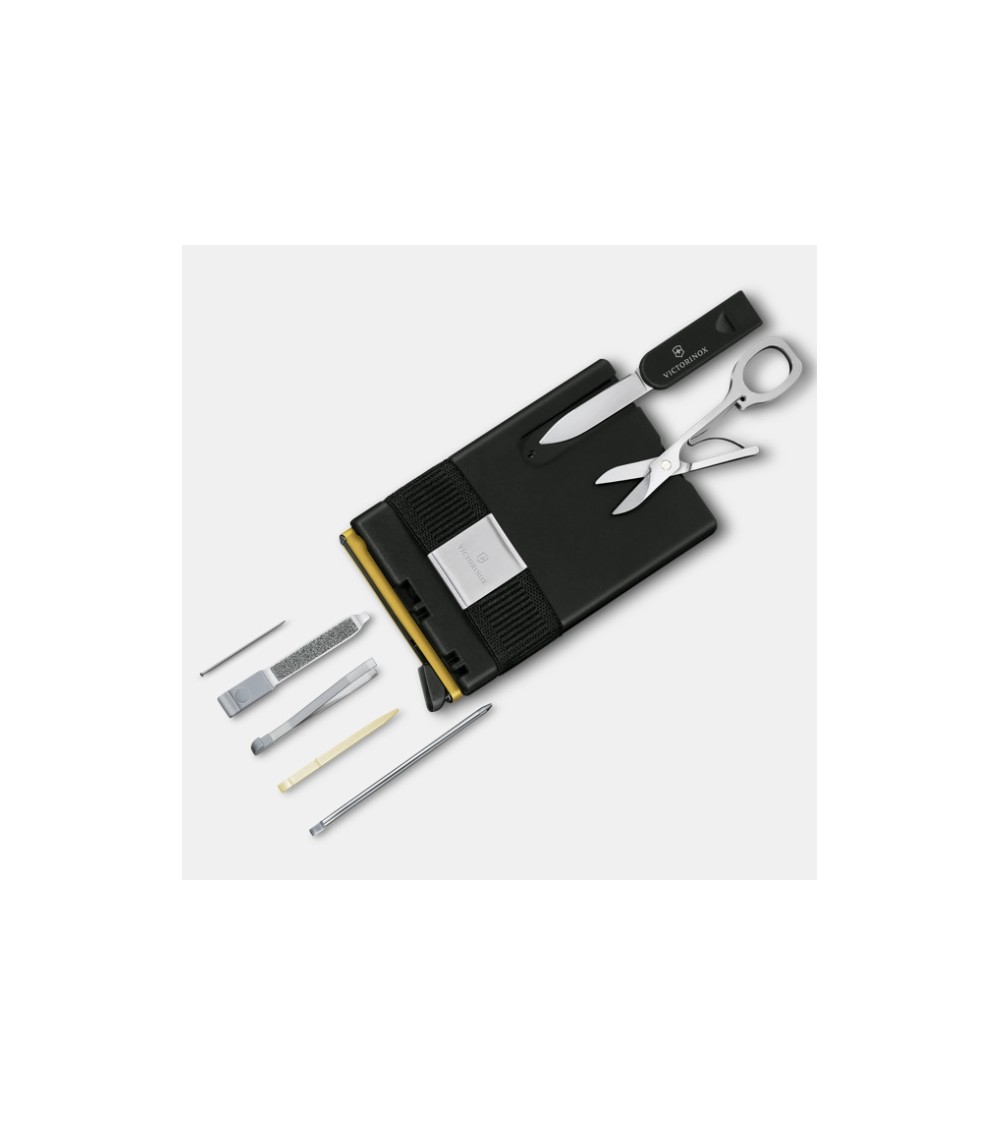 Outils Porte-cartes / Bande élastique pour billets et reçus / Petite lame / Ciseaux / Lime à ongles | Tournevis 2,5 mm / Pin / Pincettes / Cure-dents / Stylo à bille pressurisé / Lime à ongles Dimensions Hauteur: 17 mm Longueur: 104 mm Largeur: 65 mm Poids: 81 g Détails No. d'article: 0.7250.38 Pays d'origine: Suisse Matériau: ABS/Cellidor Lame blocable: Non Lame à une main: Non Nb de fonctions: 10 Couleur: Noir Garantie Ce produit est couvert par la garantie à vie de Victorinox
