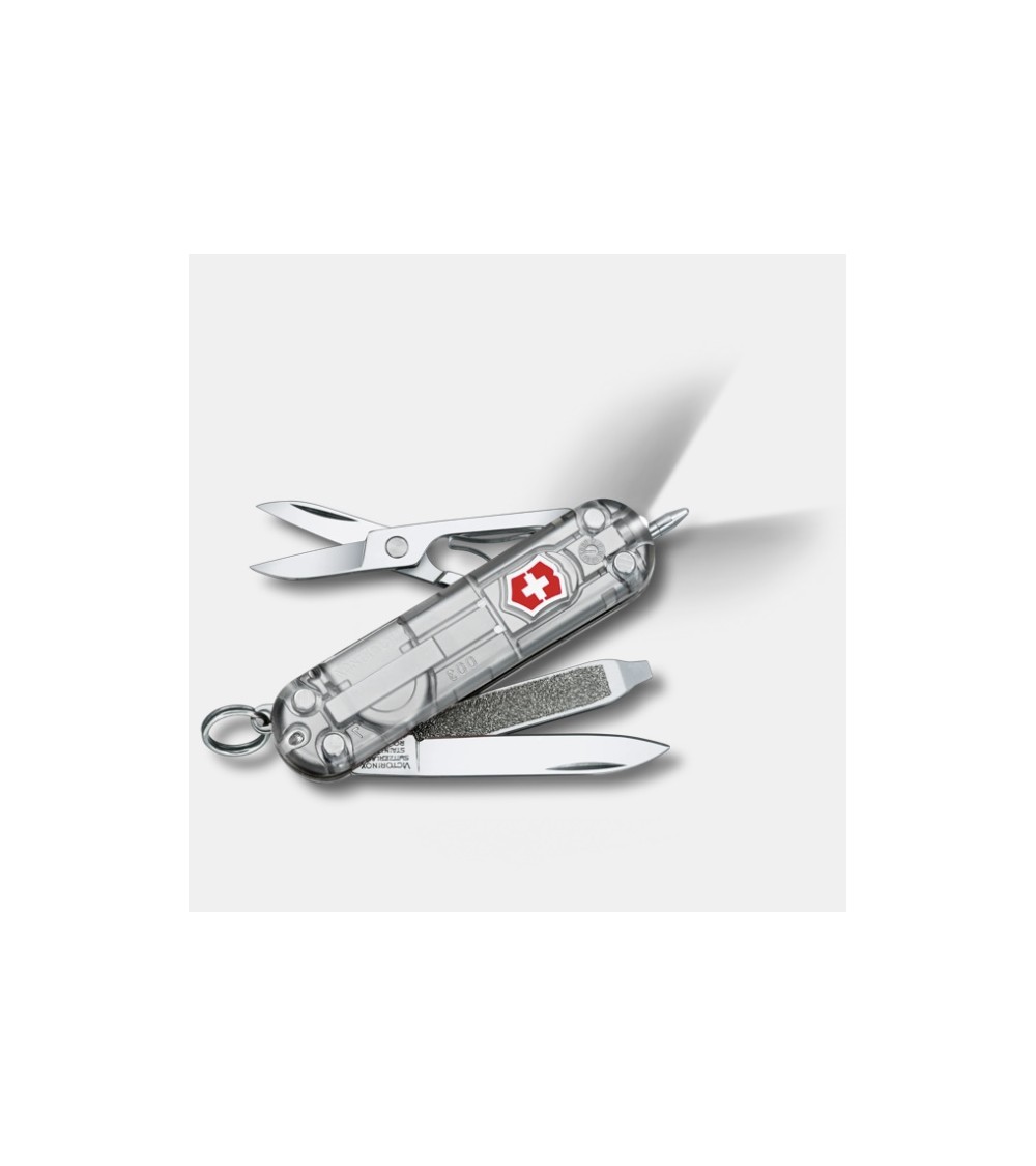 Petit couteau de poche avec lampe LED « Vous auriez un stylo ? » Vous pourrez éliminer cette phrase de votre vocabulaire lorsque vous aurez glissé le couteau Signature dans votre poche. En plus des fonctions traditionnelles du petit couteau suisse, il est équipé d'un stylo à bille pressurisé. Ajoutez lui une lampe à LED et plus rien ne pourra vous arrêter, pas même lobscurité. La série Signature regroupe des couteaux dune fonctionnalité incomparable.