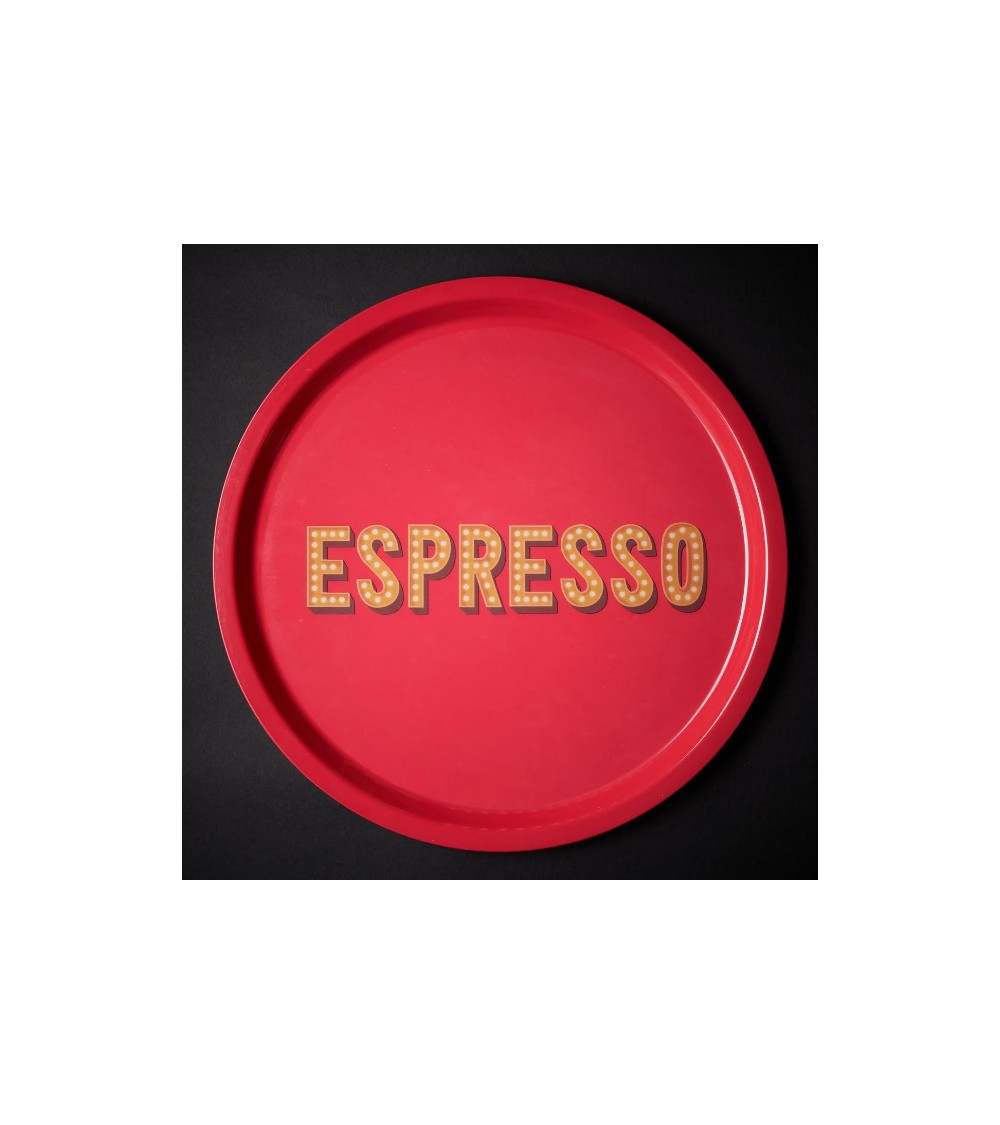 Faites rimer vos pauses café avec style grâce à ce plateau rond rouge éclatant au look rétro. Son inscription « ESPRESSO » façon enseigne lumineuse apporte une touche joyeuse et décalée à votre cuisine ou à votre coin café. Idéal pour servir vos tasses, transporter vos douceurs ou simplement décorer votre espace avec un esprit barista.