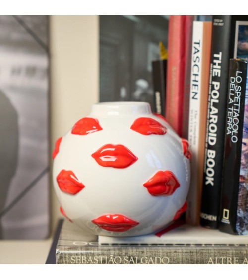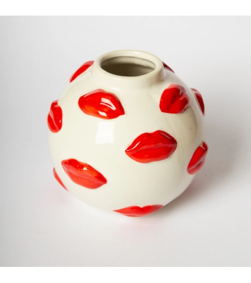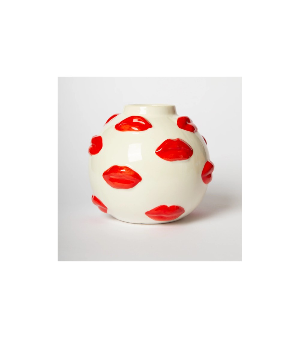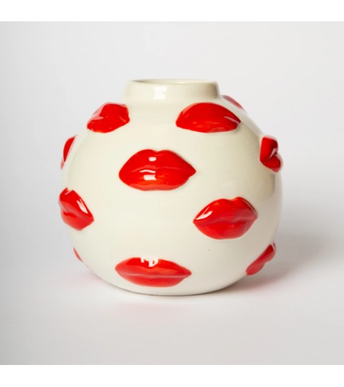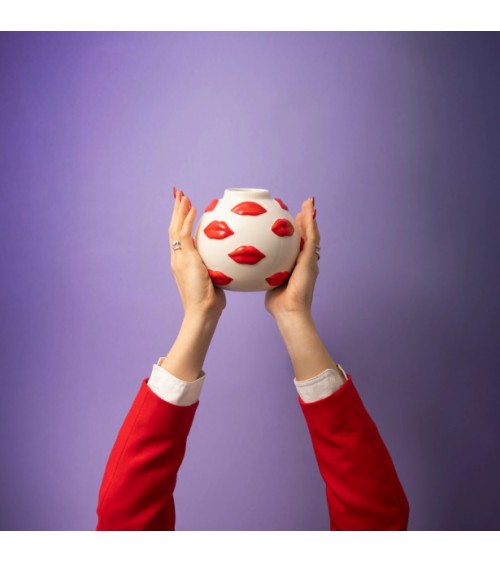 Osez la déco qui attire tous les regards ! Ce vase boule en céramique blanche, habillé de baisers rouge vif en relief, apporte une touche de fantaisie et de sensualité à votre intérieur. À la fois objet déco et pièce design, il sublime vos bouquets autant quil se suffit à lui-même en sculpture moderne.