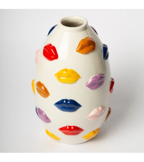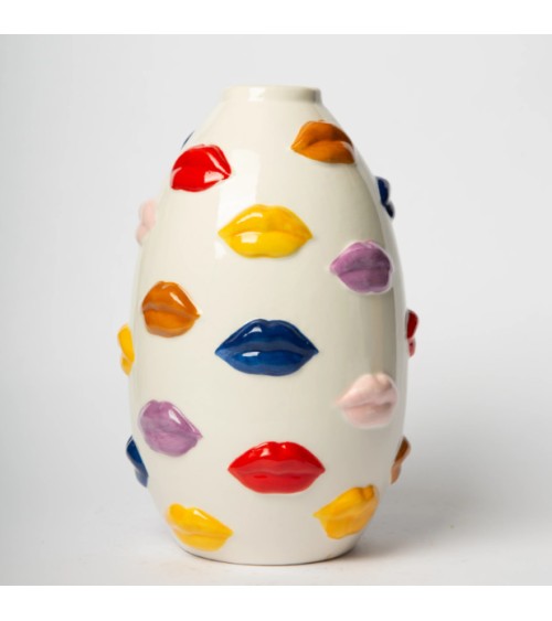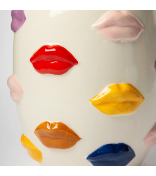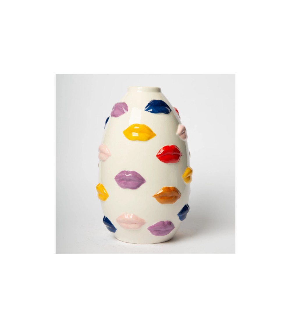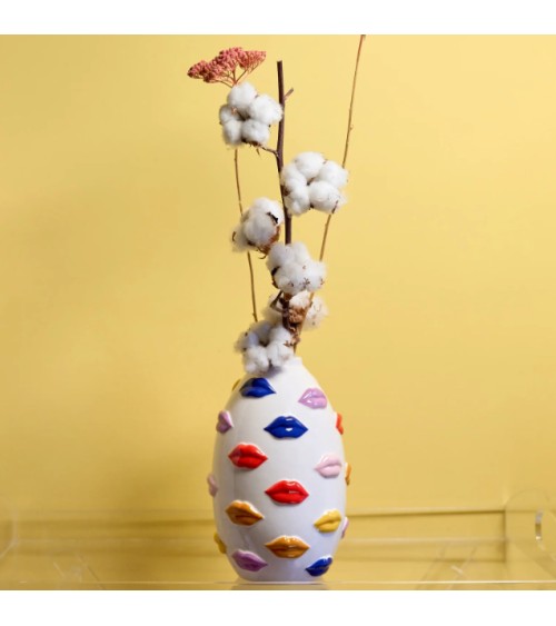 Osez la déco qui attire tous les regards ! Ce vase boule en céramique blanche, habillé de baisers multicolores en relief, apporte une touche de fantaisie et de sensualité à votre intérieur. À la fois objet déco et pièce design, il sublime vos bouquets autant quil se suffit à lui-même en sculpture moderne.