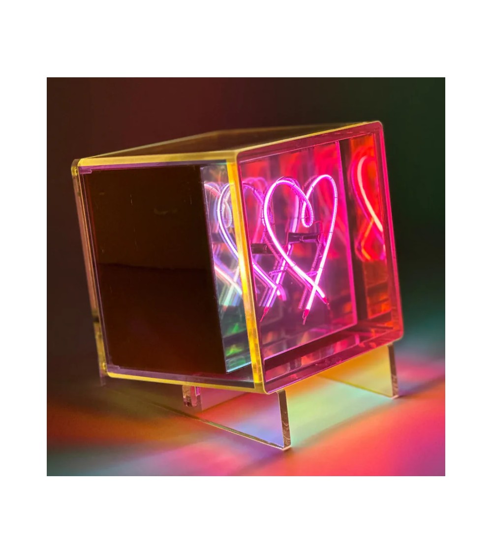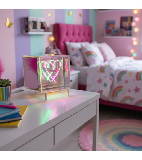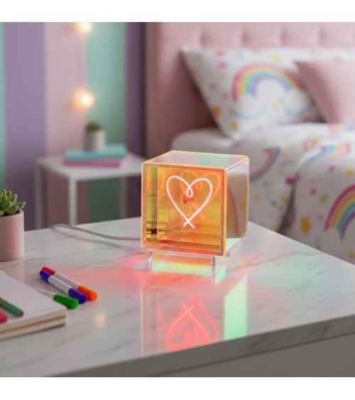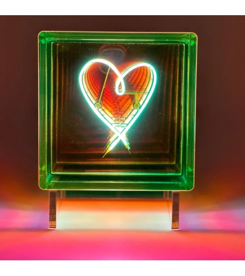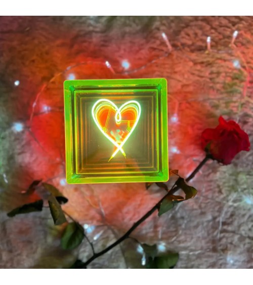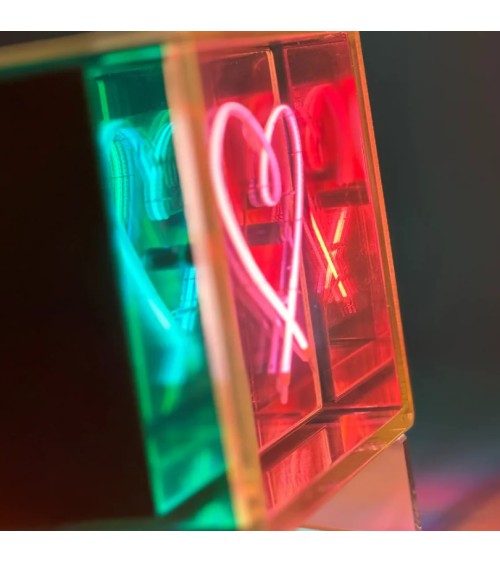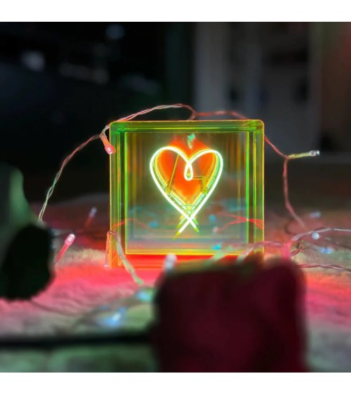 La MITBOX joue avec la lumière et la profondeur grâce à son effet miroir et son acrylique irisé. Ce cube LED sans fil diffuse une lueur unique. Son message lumineux "HEART" symbolise lamour et lémotion, apportant une touche élégante à votre intérieur. Fourni avec son support discret et élégant pour une mise en valeur immédiate.