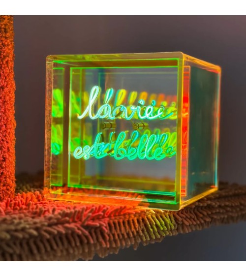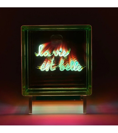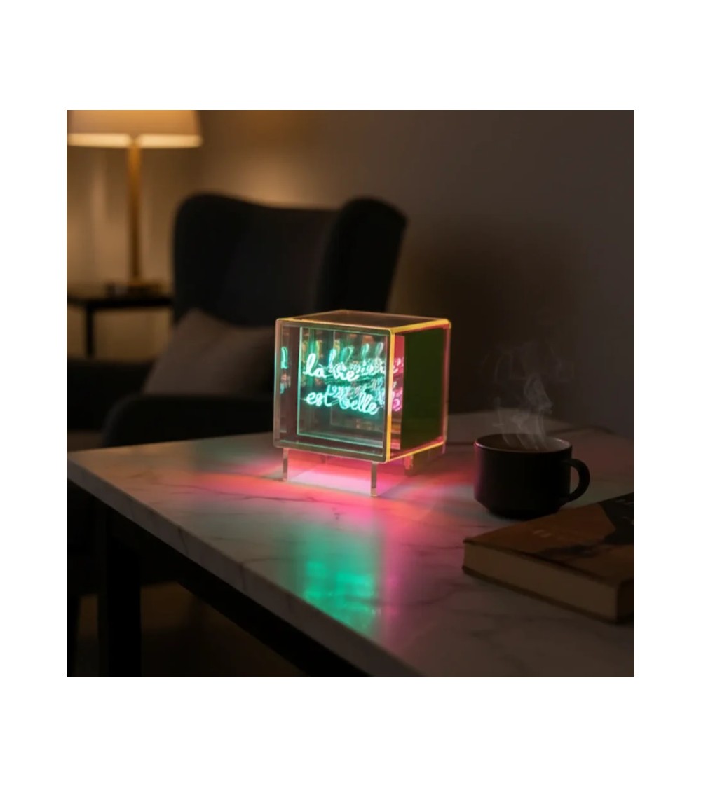 La MITBOX joue avec la lumière et la profondeur grâce à son effet miroir et son acrylique irisé. Ce cube LED sans fil diffuse une lueur unique. Son message lumineux "HEART" symbolise lamour et lémotion, apportant une touche élégante à votre intérieur. Fourni avec son support discret et élégant pour une mise en valeur immédiate.