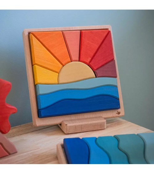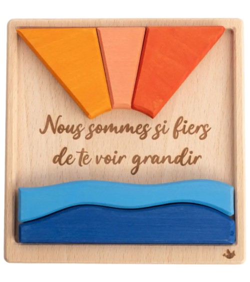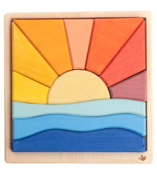 Avec ce puzzle poétique représentant un coucher de soleil, votre enfant apprendra à associer les formes pour recréer ce magnifique paysage. Dabord, il pourra saider du modèle fourni. Puis, une fois suffisamment à laise, il pourra tenter dassembler les pièces en bois sans modèle, en faisant travailler ses méninges. Cette activité favorisera le calme et la concentration, permettant aux parents de vaquer à leurs occupations (ce qui est toujours appréciable !). Le cadre en bois permet de ranger et transporter facilement ce jeu, qui, à ses heures perdues, pourra également servir duvre dart sur létagère de la chambre.