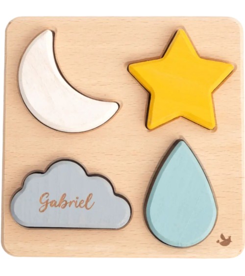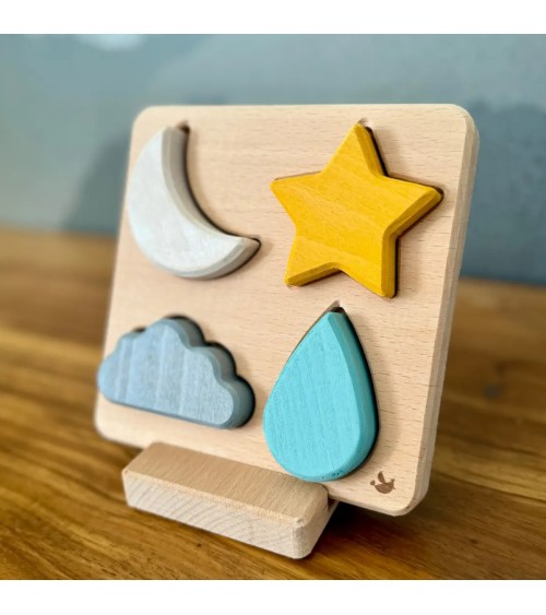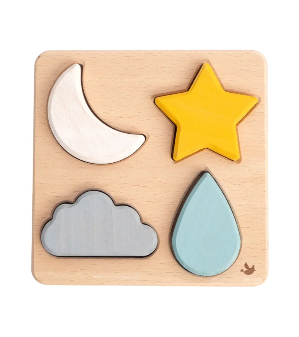 Ce jeu dencastrement sur le thème du ciel est un véritable outil pédagogique. Votre marmay devra identifier les formes des différentes pièces et les associer aux encoches correspondantes (une tâche moins aisée quil ny paraît pour les plus petits !). Ce jeu stimulera le développement de la motricité fine et renforcera la dextérité. On ne garantit pas de faire de votre progéniture un futur prix Nobel, mais il pourra profiter de moments de concentration bénéfiques pour son petit cerveau en plein développement.