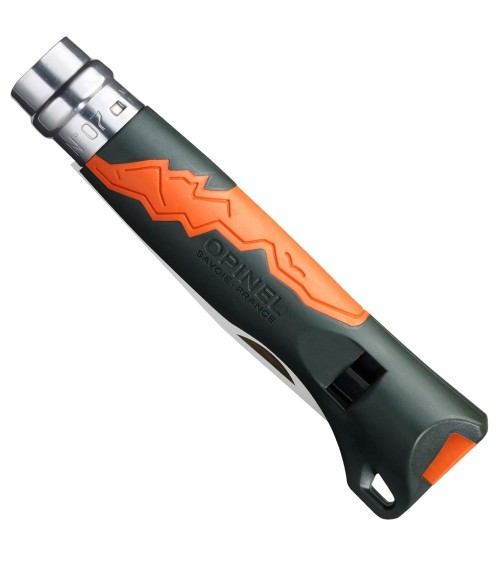 Le manche est en polyamide. Un plastique solide avec un sifflet durgence allant jusquà 110 dB intégré dans la manche. Le couteau dispose dun cordon en cuir à lextrémité du manche vous permettant dattacher le couteau à une chaîne par exemple. Cela limite le risque de perte.