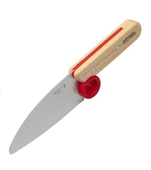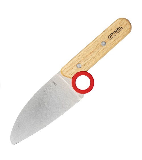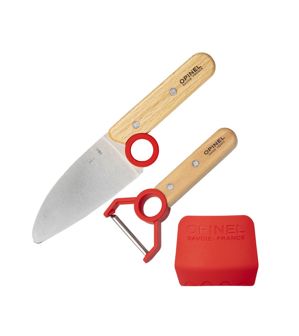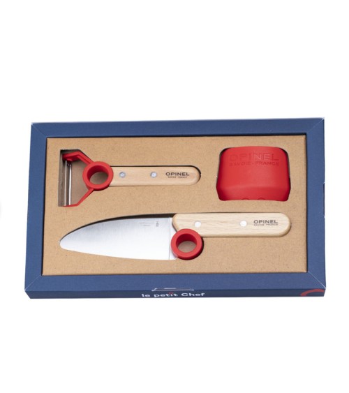 Opinel a lancé sur le marché "Le petit chef", une ligne spécialement développée pour les enfants. Set de cuisine comprend un couteau de cuisine, un éplucheur et un protège-doigts. Ce couteau de cuisine est idéal pour les enfants car il est de petite taille, tout comme sa lame. Avec son anneau en plastique pour l'index, il est presque impossible de ne pas tenir le couteau correctement. La sécurité des doigts de l'autre main a aussi été prise en compte. Le protège-doigt d'une dimension de 6,5 x 5,5 cm rend le découpage, en dépit d'une lame tranchante, très sûre.